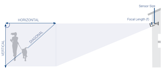 Field of View (FOV) is the maximum observable area that is seen at any given moment through an optical device such as a camera lens. The coverage of the area can be measured using the horizontal and vertical distances to find the diagonal of the area in degrees. Mathematically, the FOV is calculated using the horizontal dimension of the sensor (h) and the Focal Length (F).