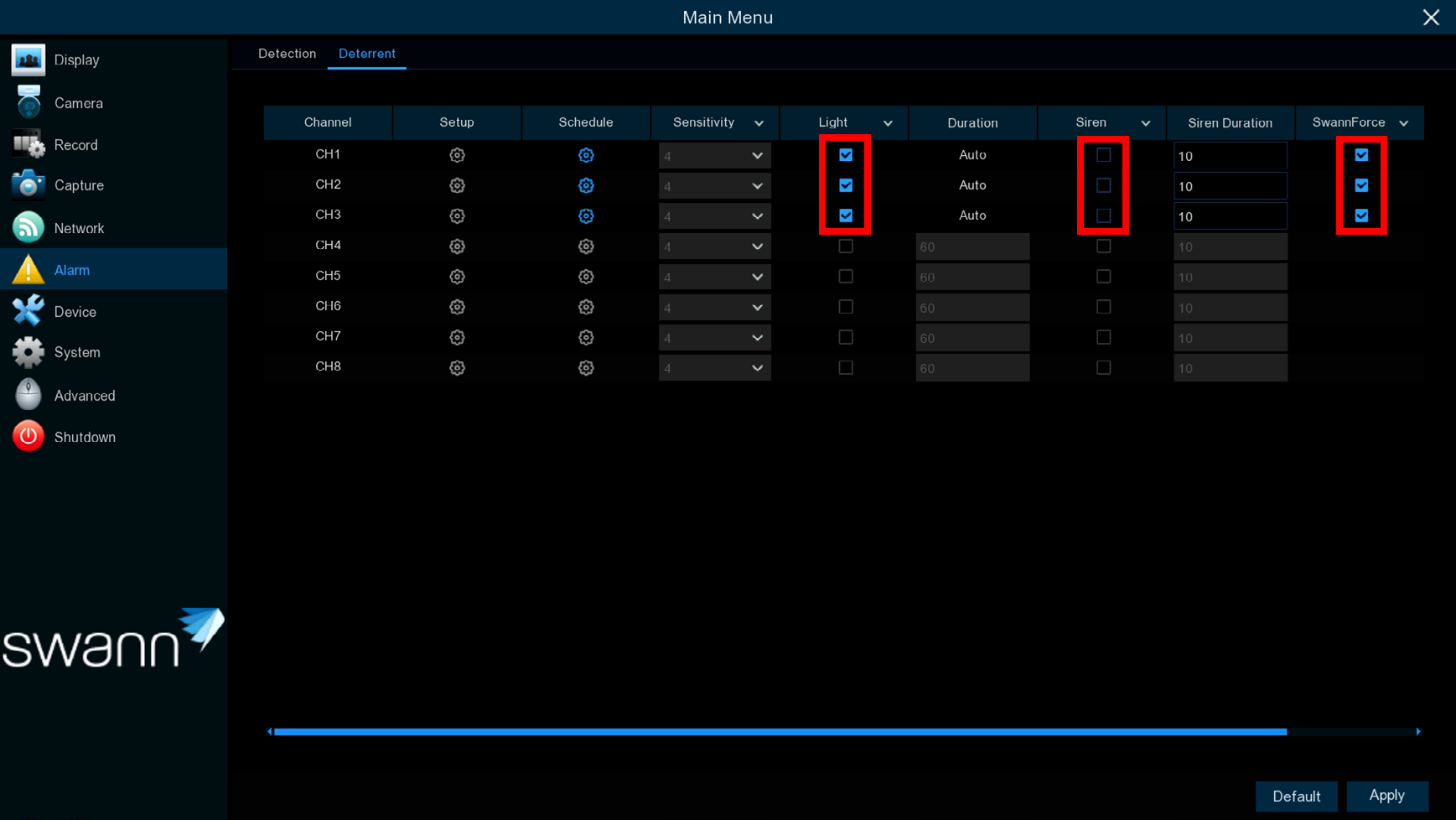 On some recorders, you can also do this via the Swann Security app. Go to Devices / Device Settings (bottom-right) then choose your recorder. Go to Channel Settings then select a channel and disable “Light on Motion” or “Siren on Motion” – it is similar to unchecking the checkbox via recorder’s Menu.