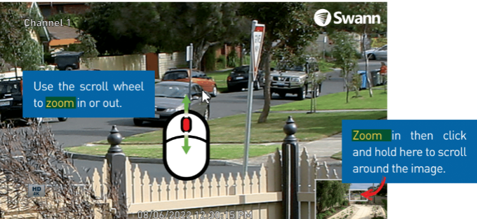 If you are viewing multiple cameras in a single view, view one channel in full screen (double-click), then use the mouse to: