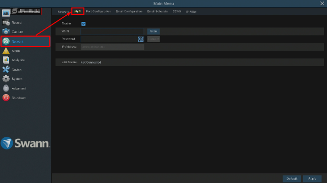 Tip: If you can’t see the Wi-Fi tab, unplug the antenna and try a different port and/or reboot the recorder while the USB Wi-Fi antenna is still connected. If none of the USB port works after rebooting and your recorder is compatible, has software version V8 and above, and the mouse works on those ports, then the USB Wi-Fi antenna could be faulty.