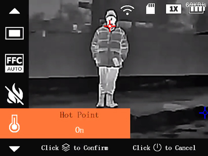 Track the hottest and lowest temperatures in your camera’s image at the same time. If enabled, your camera’s image will display a red target tracking the hottest point and a blue target tracking the lowest point.