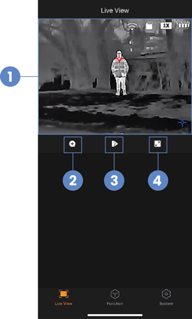 The Live View is the first screen you will see when your camera connects to the app. It includes the following features: