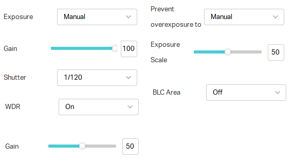 Exposure settings include exposure gain and shutter speed. Higher gain and slower shutter speed allow more light to enter the camera within the same time frame, resulting in a brighter image, and vice versa for a darker image.