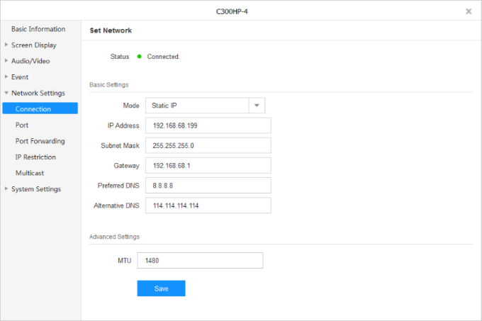 Open VIGI Security Manger and go to Settings > Device > Device List > My Devices > Settings icon of the camera > Network Settings > Connection.