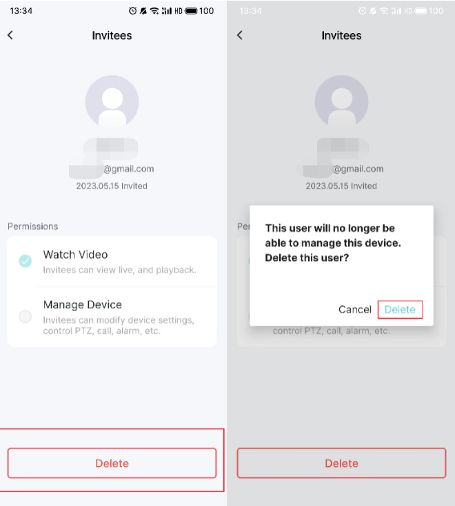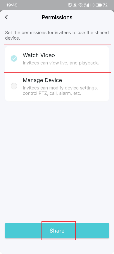 Step 3. Set the Permissions for the invitees. Note that there are two different permissions for your invitees. Watch Video will restrict their privilege to only watch live and playback. If you want to give permission to your invitee for control your VIGI devices, please assign Manage Device.