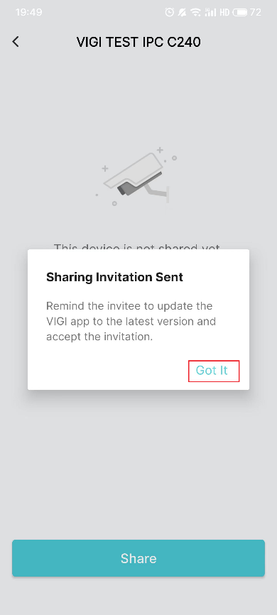 After selecting the permission for your invitee, click Share and Got It. Now the invitee can view the camera now.