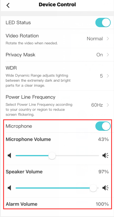 Follow the app instructions to configure the settings. You can enable HLC, set LED status, change the video direction, configure WDR, disable the microphone or adjust the microphone volume (for certain cameras), adjust the speaker/alarm volume (for certain cameras), set the night vision and light brightness (for certain cameras).