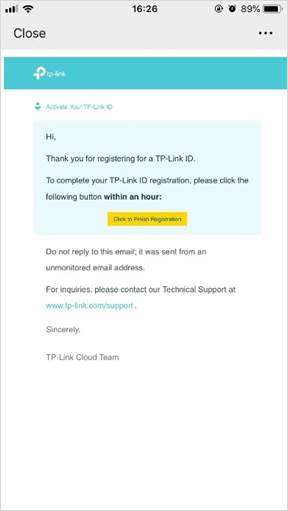 3. Open your mailbox and find the verification email. Click the Click to Finish Registration button in the email to activate the TP-Link account.