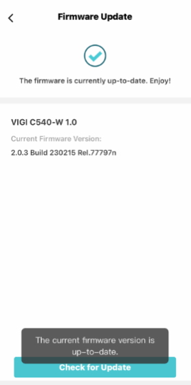 Step 3. On the Firmware Update page, VIGI app will automatically check the update for you. You can also tap on Check for Update to manually check the update of your camera.