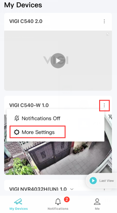 1. On the My Devices page, tap on your three-dot icon on the model. Then tap on More Settings. Here we take VIGI C540W as an example.
