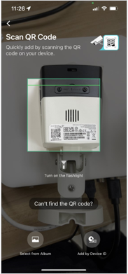 3.Tap the + button on the top right and scan the QR code on your camera. You can find the QR code printed on the product label of your camera.