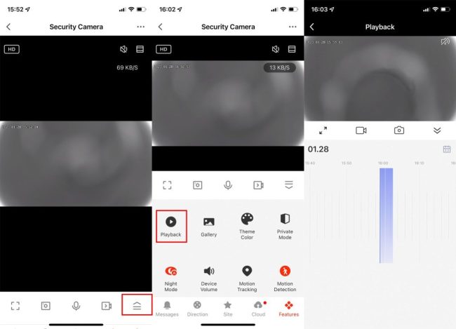 In the live video screen of the camera, click on Playback to view the video on the memory card, the coloured time indicates the recorded video.