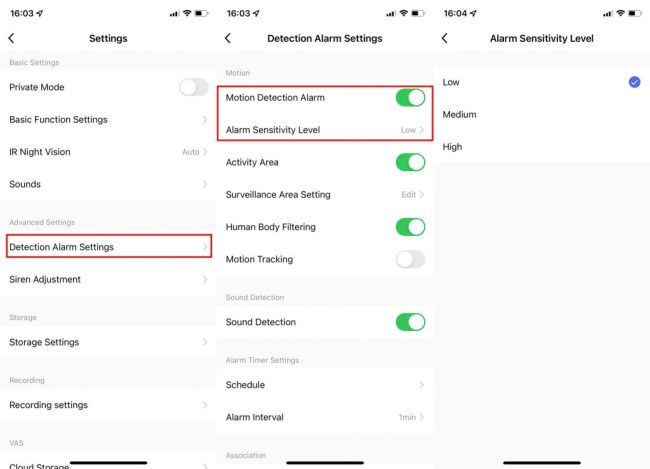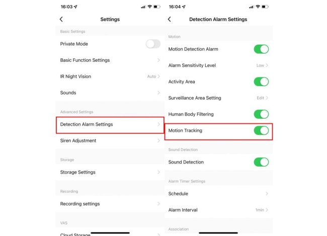 Click on Detection Alarm Settings, turn on Motion Detection Alarm and the app will send a notification to your mobile phone when the camera detects a moving object.