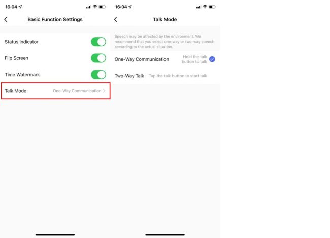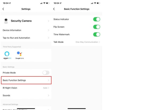 In Basic Function Settings, you can switch on and off the camera’s Status Indicator, Flip Screen, Time Watermark and Talk Mode.