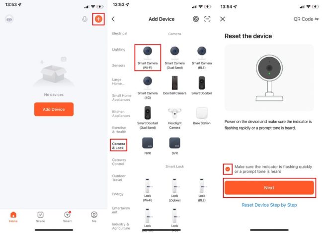 1. Click on the ‘+’ icon, select ‘Camera & Lock’ and Smart Camera (Wi-Fi)
