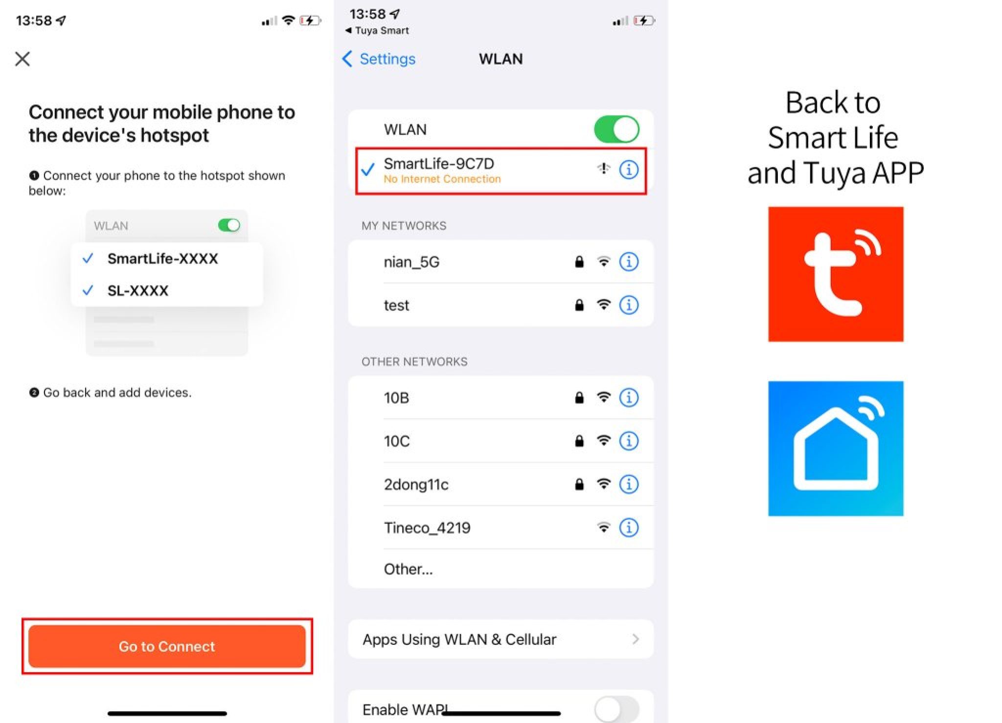 3. Click Go to Connect, connect to the camera’s hotspot wifi, then return to the Smart Life or Tuya APP.