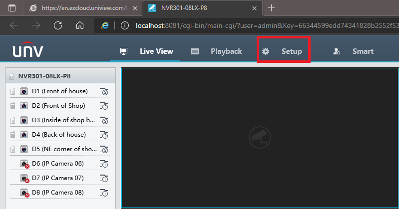 Navigate to your NVR on your web page. You can do this by accessing it via the EZCloud or by the local IP address. If you are unsure how to do this, CLICK HERE for a tutorial on how to do so. Please keep in mind that if you access your NVR via the local IP address, it will ask you to log in. This log in is the same username and password you created for your NVR directly.