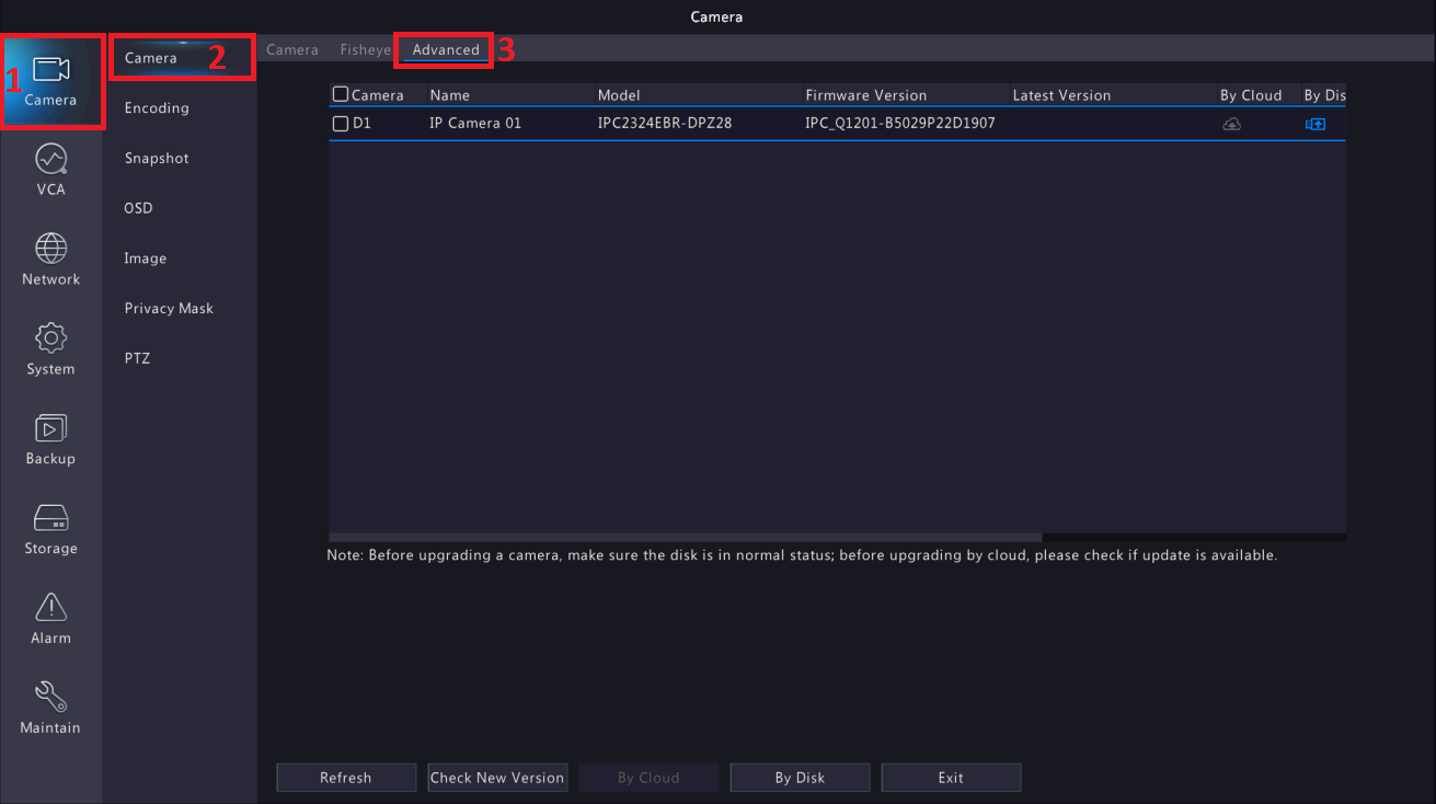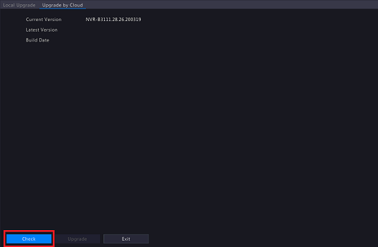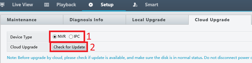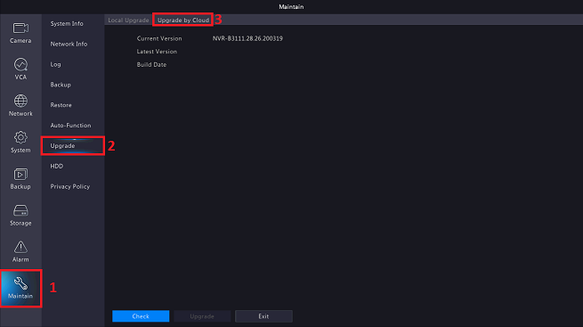 PLEASE NOTE: Some units with older firmware will not have the “Cloud Upgrade” tab. However, you can still cloud upgrade your firmware. Instead of looking for the tab at the top, look in the maintenance submenu and find a button that says “Check” or “By Cloud”, depending on what firmware you have. This will allow you to upgrade your NVR.