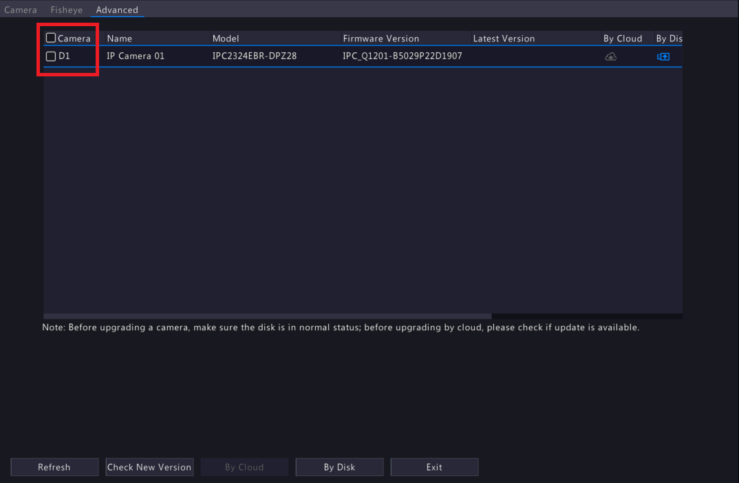 Select the cameras you want to update by clicking the checkbox next to the camera’s name. You may also select the top checkbox to select all cameras.