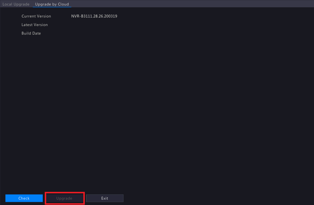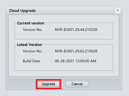 If an update is available, you will see the new version at the top in the “Latest Version” row. To upgrade your NVR, click the “Upgrade” button on the bottom of the screen.