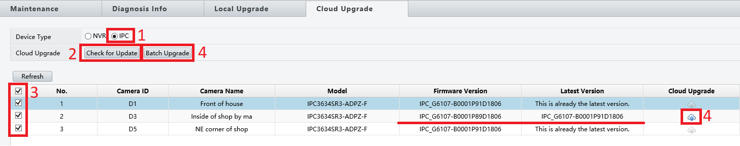 There are two options for finalizing the upgrade. You may click “Batch Upgrade” in the Cloud Upgrade Row, or you may click the Cloud Upgrade icon in the “Cloud Upgrade” column on the bottom right of the below figure. Typically, if you have multiple cameras with available upgrades, it’s easier to click “Batch Upgrade”.