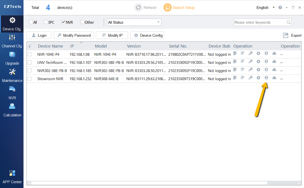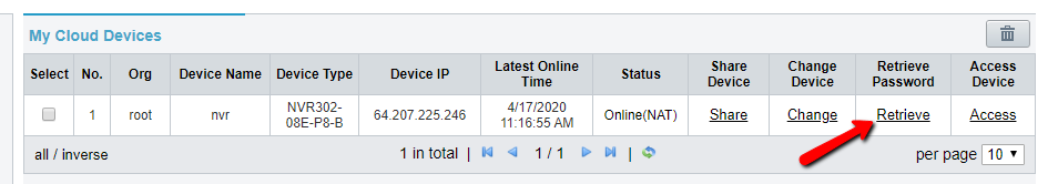 - Locate the camera that you need access to in the list and look all the way to the right hand side of its listing