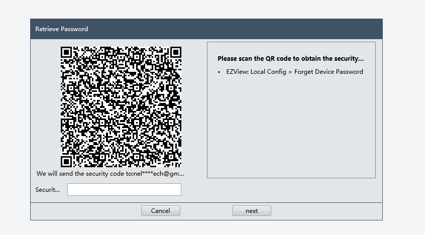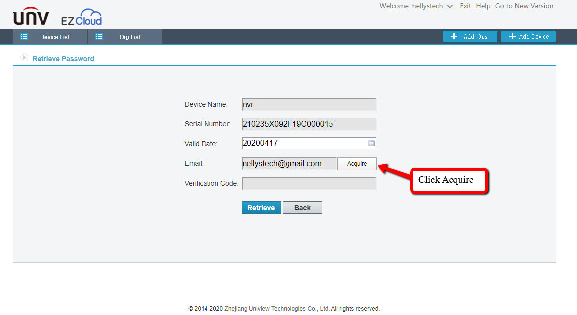 - Open your e-mail. Within a minute or two the verification code will arrive. Retrieve the verification code and type it into the EZCloud window where the verification code is requested. Note: The verification code is only valid for 30 minutes after clicking the acquire button.