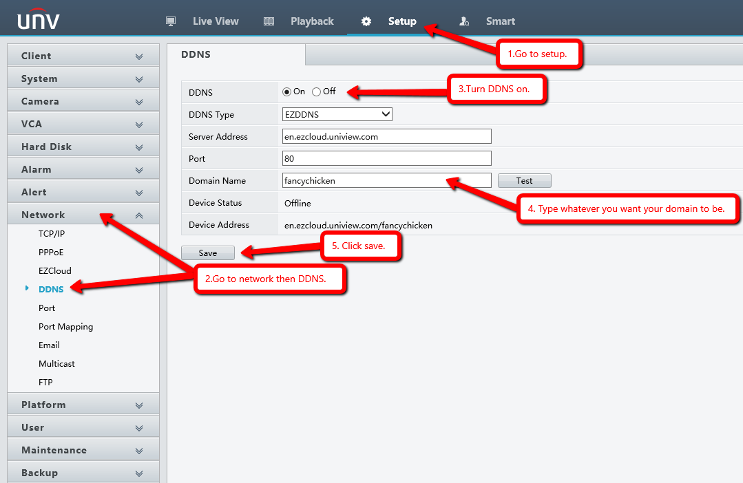 Below you can see the web interface for a Uniview NVR. You will need to navigate to the IP address of the unit. Then go to Setup>Network>DDNS.