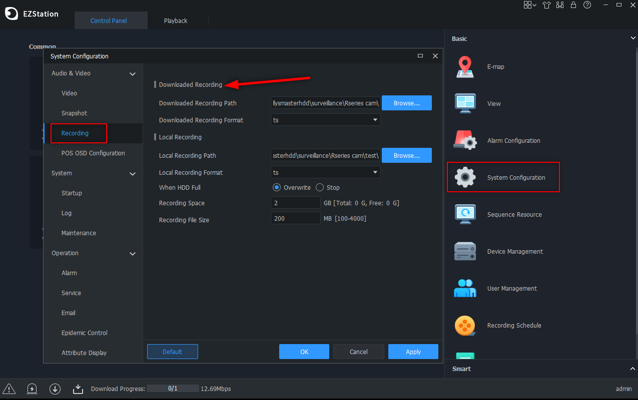 To change the File Path, from the Control Panel in EZStation, select the System Configuration icon, then Recording Tab.