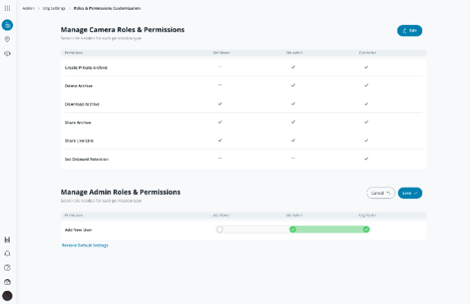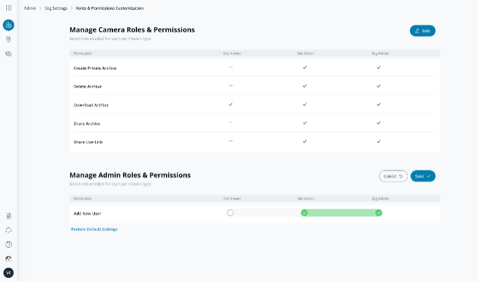 Verkada’s Roles & Permissions Customization feature enables Org Admins the ability to add or remove certain permissions from Site Admins and Site Viewers more granularly. Some organizations may want to limit or extend the permissions of the members of their organization based on their needs. Currently, we allow customization of permissions related to archives, link sharing, and user management.