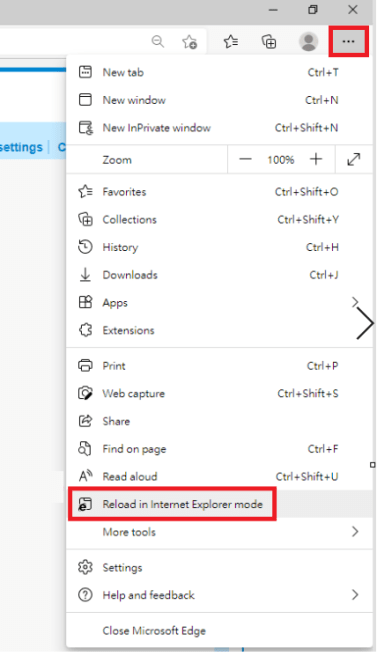 4. Go to settings and more”…” → Click “Reload in Internet Explorer mode”.