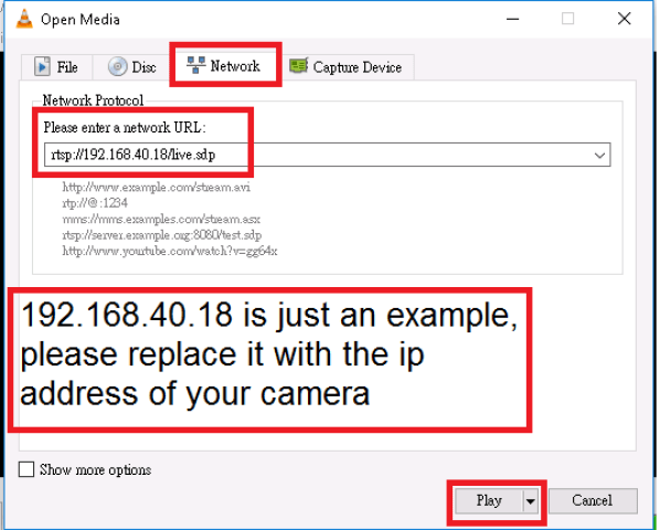 Enter the RTSP Stream URL: In the network URL box, enter the RTSP URL of your camera and click on the Play button to start streaming.