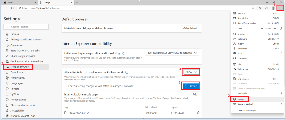 2. Go to settings and more”…”→ Click ”Settings” → ” Default browser” → Choose “Allow” in Allow sites to be reloaded in Internet Explorer mode → Restart