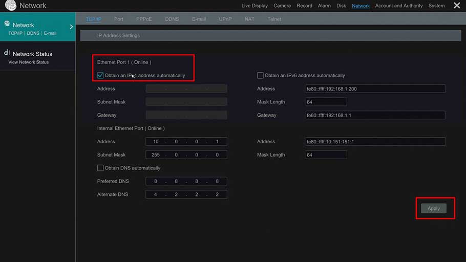 The NVR will automatically detect these settings and configure for best results once you have connected an Ethernet cable to the back of the NVR.